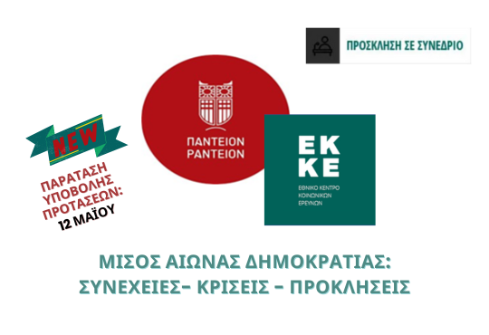 Πρόσκληση για υποβολή πρότασης στο συνέδριο με θέμα: «ΜΙΣΟΣ ΑΙΩΝΑΣ ΔΗΜΟΚΡΑΤΙΑΣ Συνέχειες- Κρίσεις – Προκλήσεις» που συνδιοργανώνεται από το Τμήμα Πολιτικής Επιστήμης και Ιστορίας του Παντείου Πανεπιστημίου Κοινωνικών και Πολιτικών Επιστημών και το Εθνικό Κέντρο Κοινωνικών Ερευνών (ΕΚΚΕ)
