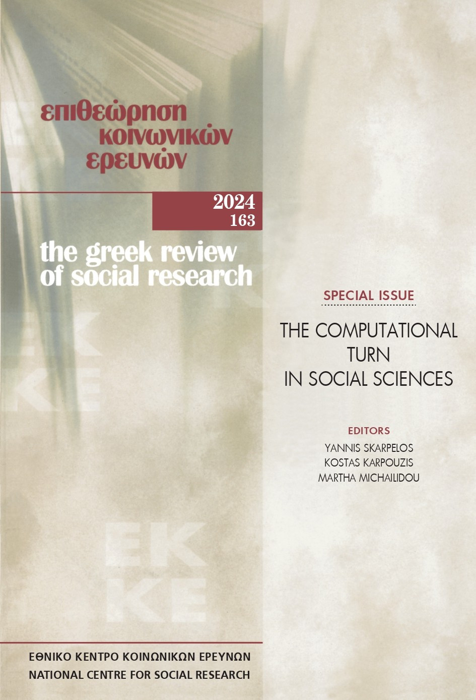 Εκδόθηκε τον Ιούλιο 2024 το ειδικό τεύχος Νο 163 της Επιθεώρησης Κοινωνικών Ερευνών με τίτλο "The Computational Turn in Social Sciences". Το τεύχος επιμελήθηκαν οι: Yannis Skarpelos, Kostas Karpouzis και Martha Michailidou.