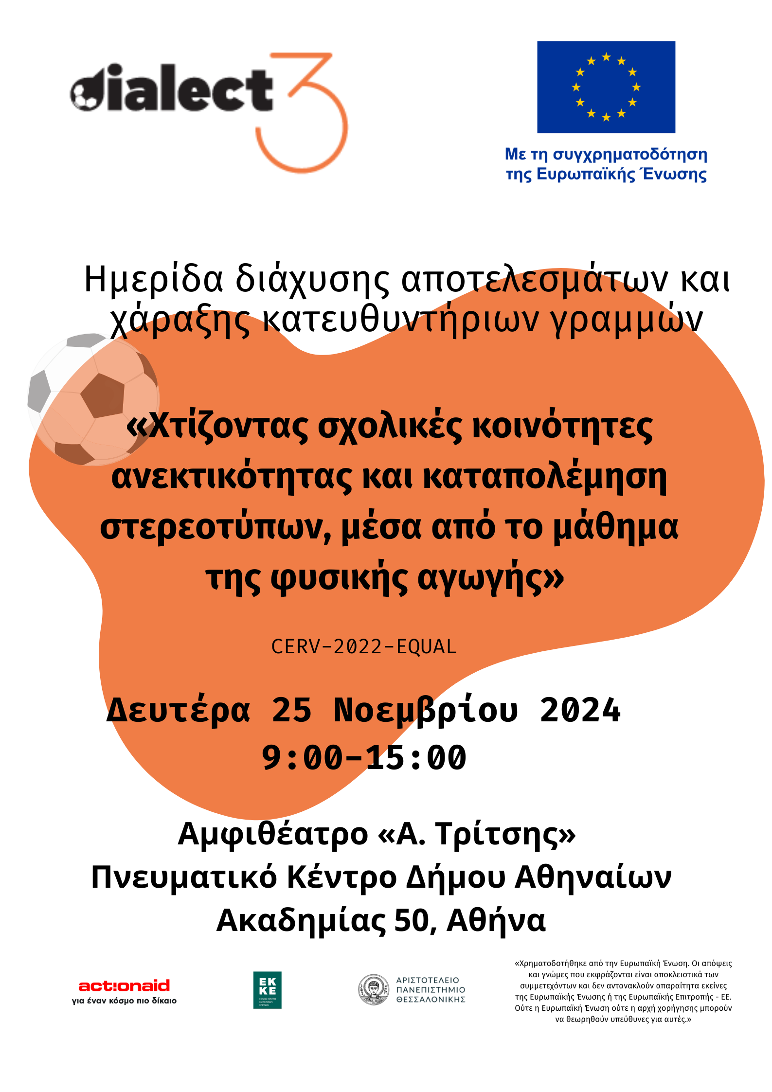 Η ημερίδα διοργανώνεται από το Εθνικό Κέντρο Κοινωνικών Ερευνών (ΕΚΚΕ) σε συνεργασία με τη Σχολή Επιστημών Φυσικής Αγωγής και Αθλητισμού του Αριστοτέλειου Πανεπιστημίου Θεσσαλονίκης (ΑΠΘ) και την ActionAidHellas (ΑΑΗ) στο πλαίσιο του ευρωπαϊκού έργου (CERV-2022 EQUAL) με τίτλο: «DIALECT3 - Χτίζοντας σχολικές κοινότητες ανεκτικότητας και καταπολέμηση στερεοτύπων, μέσα από το μάθημα της φυσικής αγωγής»