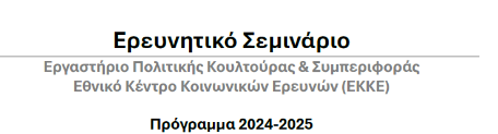 Με μεγάλη μας χαρά ανακοινώνουμε το πρόγραμμα του Ερευνητικού Σεμιναρίου του Εργαστηρίου Πολιτικής Κουλτούρας και Συμπεριφοράς του Εθνικού Κέντρου Κοινωνικών Ερευνών (ΕΚΚΕ) για το ακαδημαϊκό έτος 2024-2025.